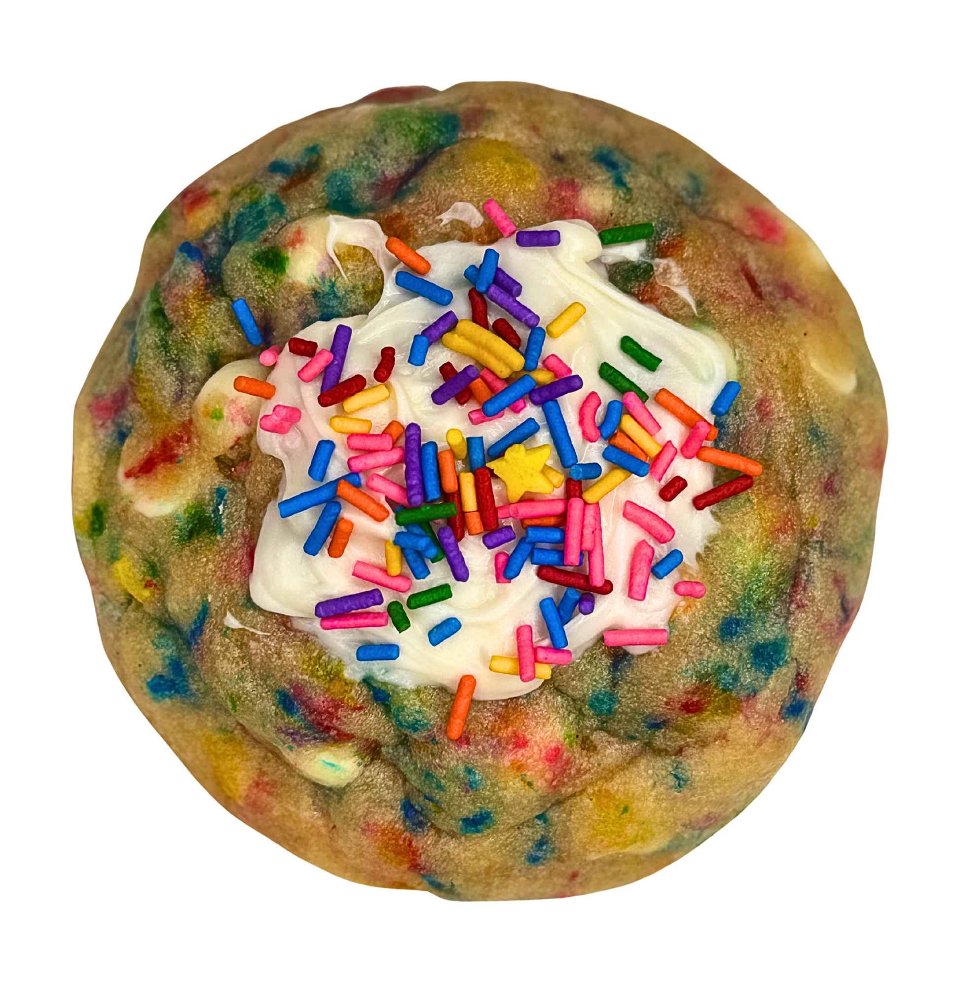 A soft, bakery-style vanilla cookie with white chocolate and colorful sprinkles, stuffed with a buttercream center.